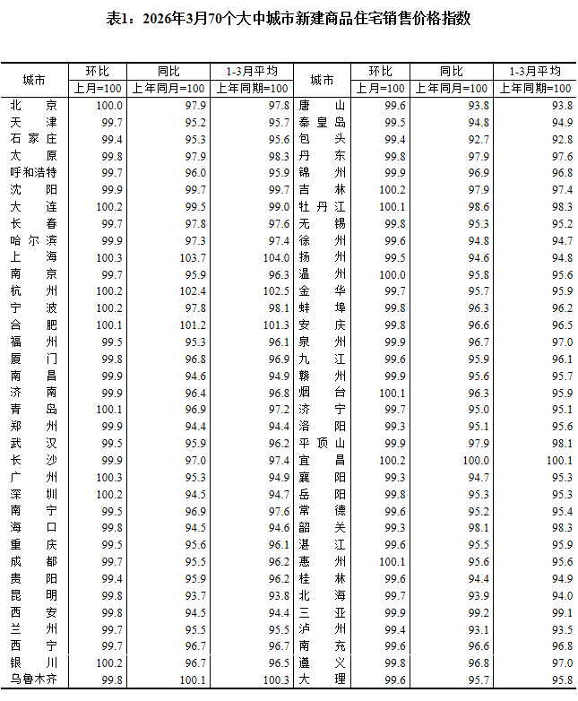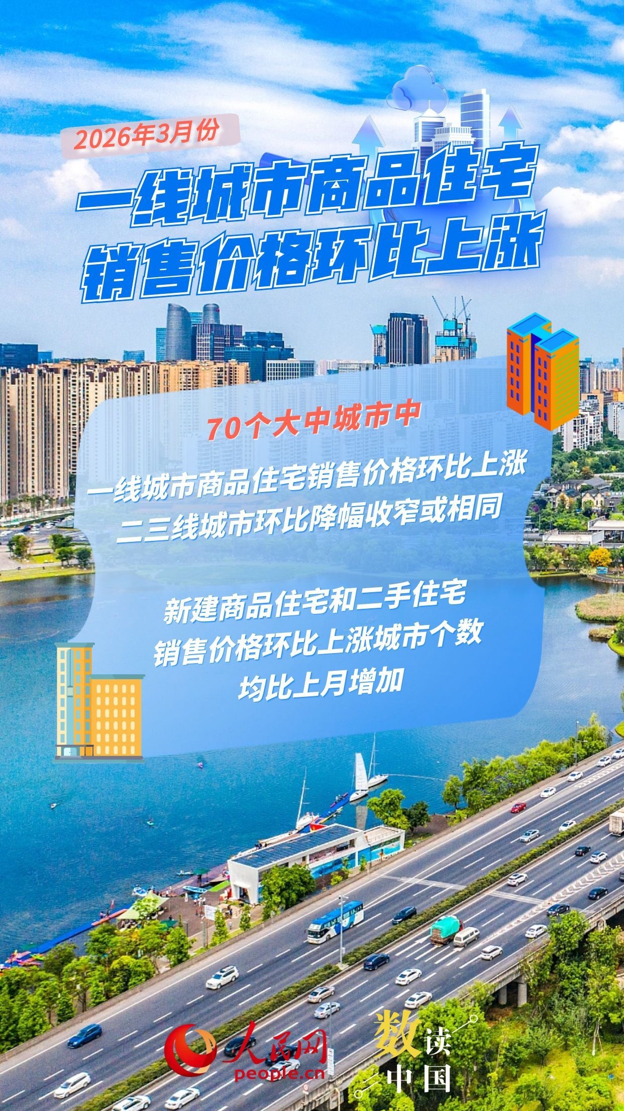 人民网北京4月16日电 (记者杨曦)国家统计局今日公布数据显示,2026年3月份,70个大中城市中,一线城市商品住宅销售价格环比上涨,二三线城市环比降幅收窄或相同。新建商品住宅和二手住宅销售价格环比上涨城市个数均比上月增加。