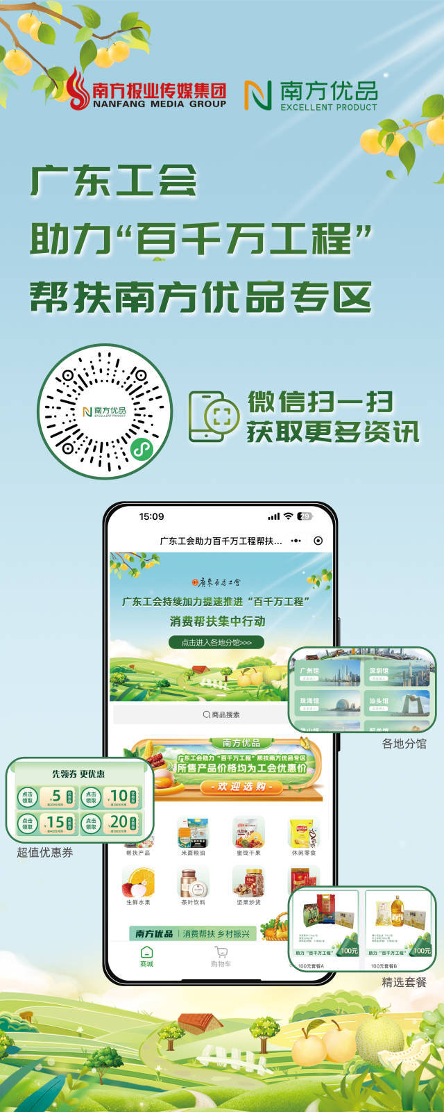 南方优品是南方报业全资运营的大湾区文化文旅农商融合的标杆性综合电商服务平台,作为广东省总工会指定帮扶平台之一,线上线下聚焦助力“百千万工程”横向、纵向帮扶和乡村振兴驻镇帮镇扶村工作地区农副产品销售,扎实推进“百千万工程”落地见效。