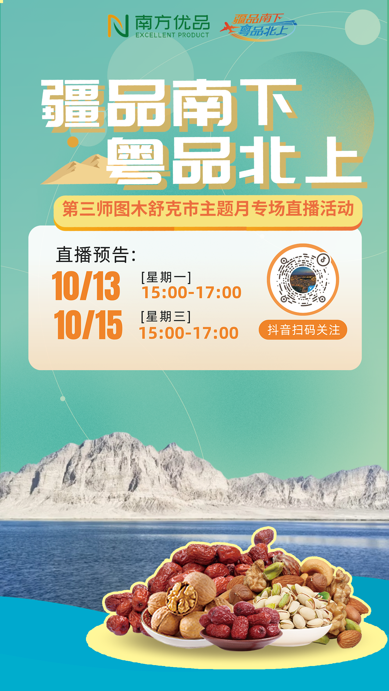 从塔里木河到珠江口,从枣园的风到湾区的月,“疆品南下 粤品北上”第三师图木舒克市主题月,不仅是一场消费盛宴,更是一次心与心的靠近。这个10月,让我们相约在此,共绘一幅“疆粤同心、山海情长”的动人图景。